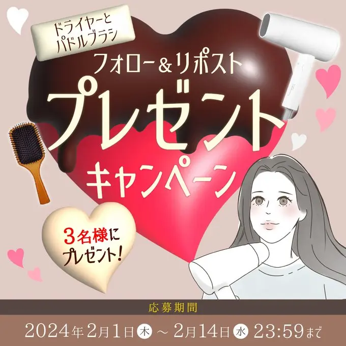 【締切】2/14(水)23:59【応募】X【提供】GALLEIDO キャンペーン概要 💐リツイートキャンペーン💐新商品のマイナスイオンドライヤーとパドルブラシをプレゼント✨ 🫧応募方法①@galleidoをフォロー② このツイートをリツイート 🫧締切2/14(23:59まで) 当選者の方にはDMでご連絡いたします😌沢山のご応募お待ちしています🧸🫧 #ドライヤー #懸賞 #プレゼントキャンペーン