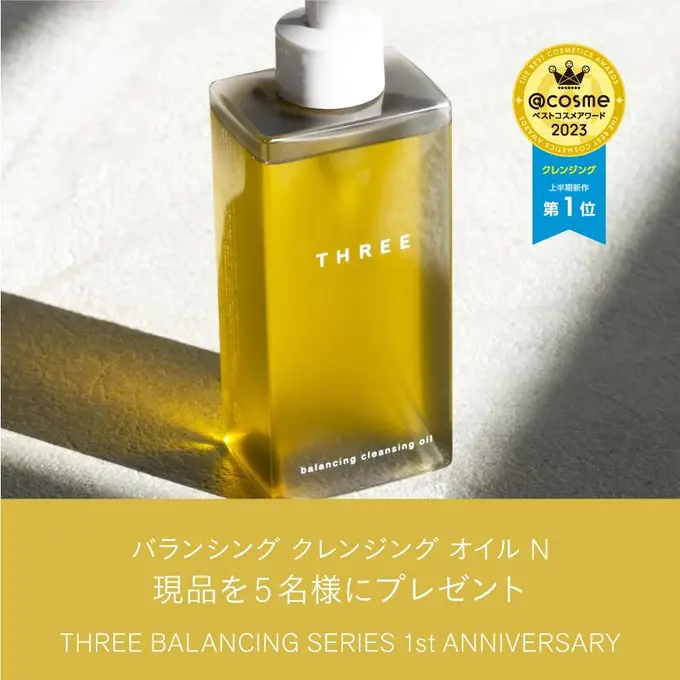 【締切】2/14(水)【応募】X【提供】THREE キャンペーン概要 THREE バランシング シリーズ誕生1周年記念! 心地よい精油の芳香と、自然の恵みを凝縮したベスコス受賞のクレンジングオイルを5名様にプレゼント🎁 ①当アカウントをフォロー② #バランシングクレンジングオイルN をつけ、あなたのクレンジングTIPSを引用RP