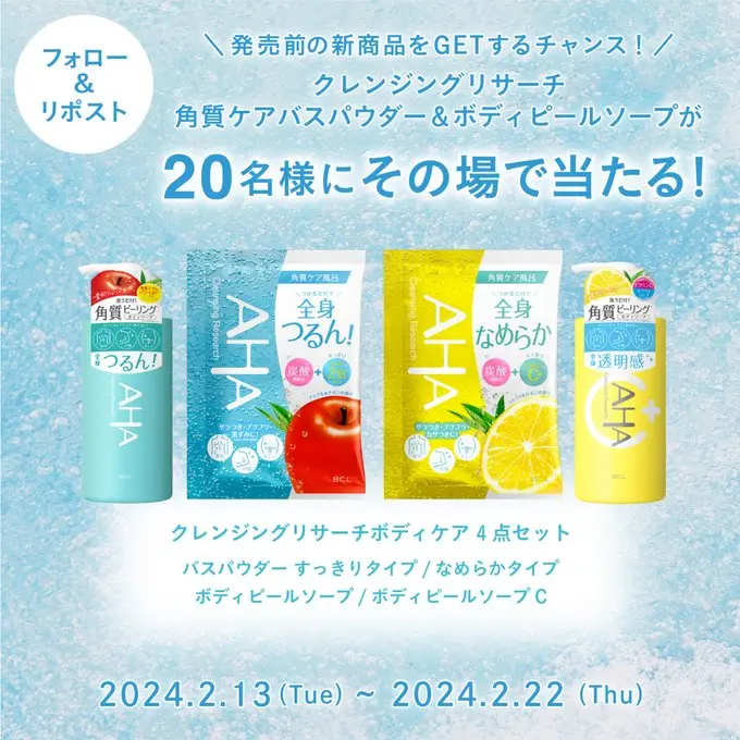 【締切】2/14(水)11:59までにRT 2/22(木)締切【応募】X【提供】BCLカンパニー キャンペーン概要 🛀春夏に向けてボディも角質ケア!#クレンジングリサーチ #プレゼントキャンペーン 3月発売のバスパウダーが一足先に当たる📣つるつるボディを目指しましょう✨ 応募方法①@BCL_companyをフォロー②本投稿を2/14 11:59迄にRT③当選者のみDMが届く