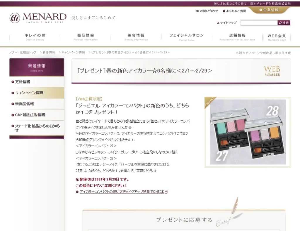 【締切】2/29(木)【応募】Web【提供】MENARD(メナード) キャンペーン概要 「ジュピエル アイカラーコンパクト」の新色のうち、どちらか1つをプレゼント! <アイカラーコンパクト 27>しなやかなピンキッシュメイク/ブルーグリーンを主役にしなやかに強く<アイカラーコンパクト 28>はじけるようなエナジーメイク/パープルを主役に華やぎはじける 27又は、28のうち、どちらか1つを選んでご応募ください♩ 応募締切は2024年2月29日です。この機会にぜひご応募ください!