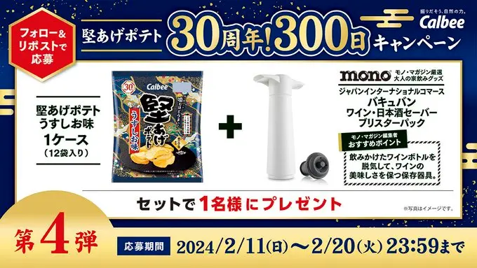 【締切】2/20(火)23:59【応募】X【提供】堅あげポテト公式【堅あげ道】 キャンペーン概要 /堅あげポテト30周年300日キャンペーン第4弾🎉\ 「#堅あげポテト うすしお味」とモノ・マガジン監修の家飲みグッズをセットで1名様に🎁 🔻応募方法🔻①当アカウントをフォロー②本投稿をリポスト締切:2/20(火)23:59まで 30周年サイトページも合わせてチェック👀https://calbee.co.jp/kataage30th/300cp