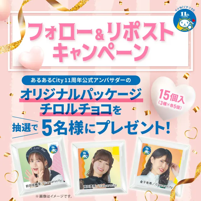 【締切】2/10(土)【応募】X【提供】あるあるCity キャンペーン概要 #あるあるCity フォロー&RPキャンペーン! #あるあるCity11周年公式アンバサダー オリジナルパッケージチロルチョコが抽選で5名様に当たる! 【参加方法】 ①あるあるCity公式X(@aruarucity2)をフォロー②この投稿をリポスト 【期間】2/10(土)まで 詳しくは▼https://00m.in/F0ghc