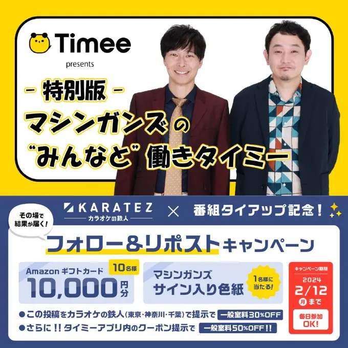 【締切】2/12(月)【応募】X【提供】Timee キャンペーン概要 /#カラ鉄タイミー#キャンペーンカラオケの鉄人🎤タイアップ✨🙌あと5日🙌\ 賞品🎁#マシンガンズ サイン色紙Amazonギフトカード 1万円分2/12(月)まで毎日参加🆗🎵 1️⃣@Timee_officialフォロー2️⃣本投稿をリポスト3️⃣結果は👇http://timee.ownly.jp/lot/29732 ▼アプリDLhttp://bit.ly/46eKC7V