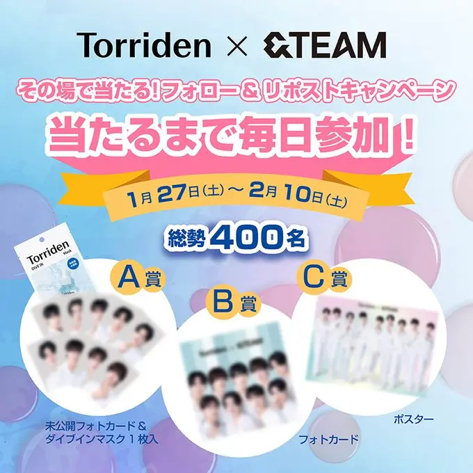 【締切】2/10(土)【応募】X【提供】トリデン キャンペーン概要 /#トリデン × #andTEAM キャンペーン!\ フォロー&リポストでオリジナルグッズや #ダイブインマスク が総勢400名様にその場で当たる🎉 2/10(土)まで毎日応募👍 規約 https://torriden-twcp.neo-atatter.com/rules 🔻応募方法1️⃣@torriden_jpをフォロー2️⃣この投稿をリポスト🔁3️⃣👇の画像から抽選参加