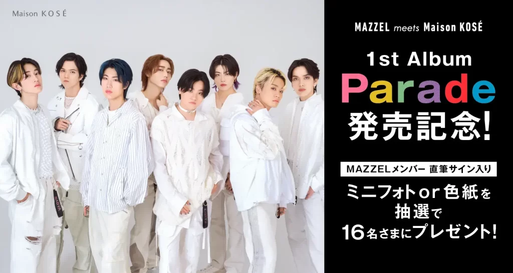 【締切】2/11(日)23:59【応募】Web【提供】Maison KOSÉ キャンペーン概要 MAZZEL 1st Album Parade 発売記念MAZZEL 直筆サイン入り特別プレゼント企画 Paradeの発売を記念して、昨年実施したWHAT’S MY TONEキャンペーンにて、店舗に飾られていたMAZZEL直筆サイン入りミニフォト、またはMAZZEL直筆サイン入り色紙を抽選で16名様にプレゼント!