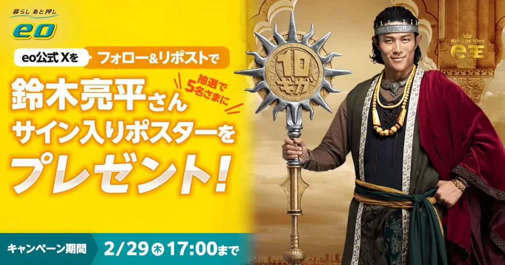【締切】2/29(木)17:00【応募】X【提供】eo キャンペーン概要 応募方法X(旧Twitter)でeo公式をフォローキャンペーン内容の投稿をリポストで応募完了! ※ アカウントを非公開にしている場合、応募対象外となりますのでご注意ください。