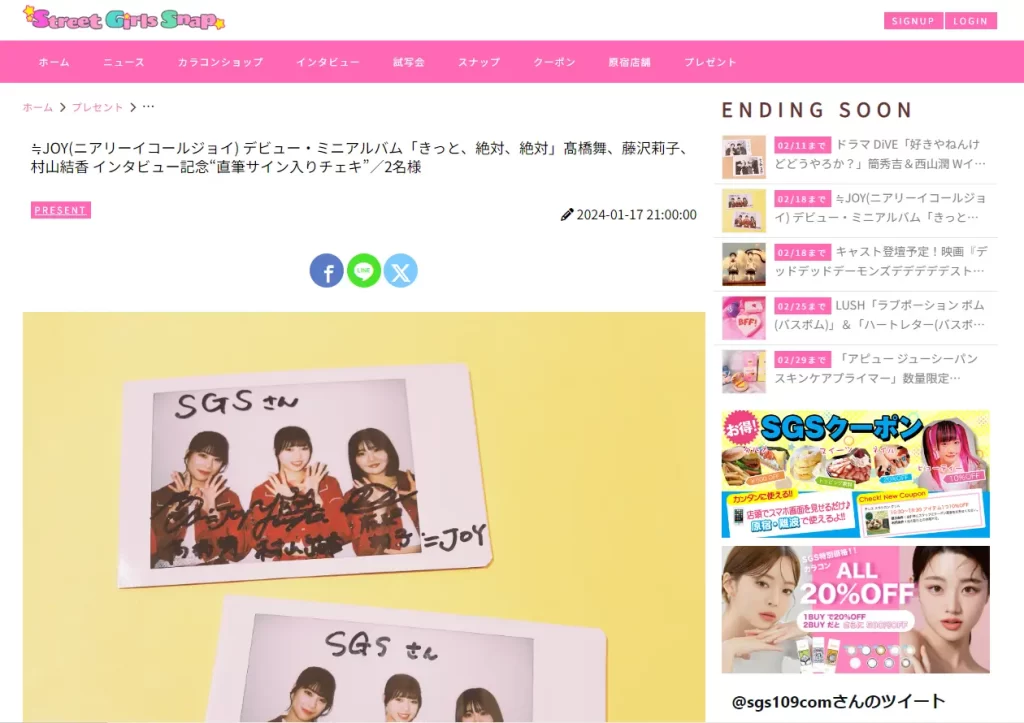 【締切】2/18(日)【応募】X/Web【提供】Street Girls Snap キャンペーン概要 [プレゼント賞品]【≒JOY(ニアリーイコールジョイ) デビュー・ミニアルバム「きっと、絶対、絶対」髙橋舞、藤沢莉子、村山結香 インタビュー記念“直筆サイン入りチェキ”】 [当選人数]2名様 [応募締切]2024年2月18日まで [応募条件]①SGS公式 X(@sgs109com)をフォローする②応募用ポストをリポストする③一番下の「応募フォーム」の質問に応えて応募ボタンを押して完了!
