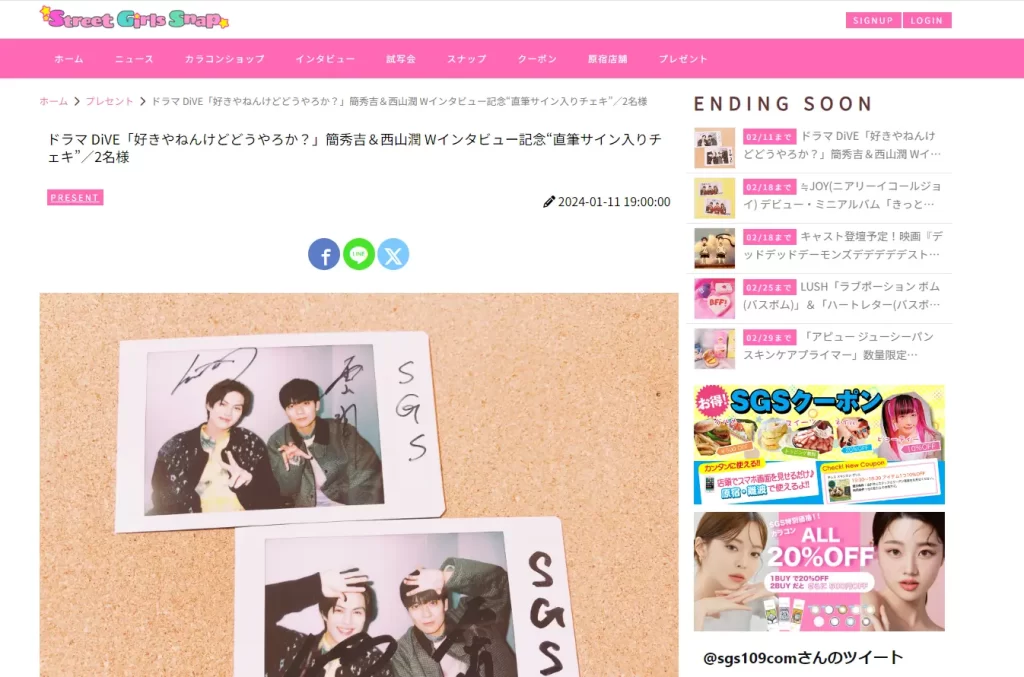 【締切】2/11(日)【応募】X/Web【提供】Street Girls Snap キャンペーン概要 [プレゼント賞品]【ドラマ DiVE「好きやねんけどどうやろか?」簡秀吉&西山潤 Wインタビュー記念“直筆サイン入りチェキ”】 [当選人数]2名様 [応募締切]2024年2月11日まで [応募条件]①SGS公式 X(@sgs109com)をフォローする②応募用ポストをリポストする③一番下の「応募フォーム」の質問に応えて応募ボタンを押して完了!