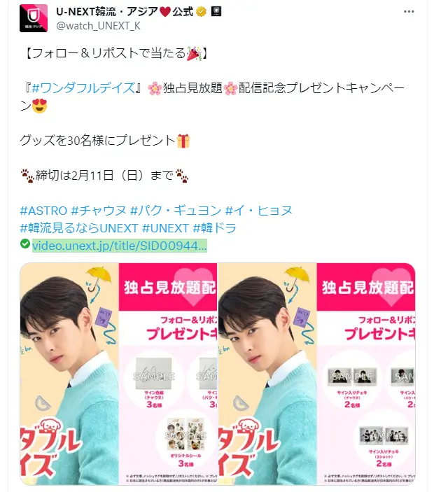 【締切】2/11(日)【応募】X【提供】U-NEXT韓流・アジア キャンペーン概要 【フォロー&リポストで当たる🎉】 『#ワンダフルデイズ』🌸独占見放題🌸配信記念プレゼントキャンペーン😍 グッズを30名様にプレゼント🎁 🐾締切は2月11日(日)まで🐾 #ASTRO #チャウヌ #パク・ギュヨン #イ・ヒョヌ#韓流見るならUNEXT #UNEXT #韓ドラhttps://video.unext.jp/title/SID0094494?cid=D32256&rid=SID0094494&adid=XXX&utm_source=twitter&utm_medium=social&utm_campaign=tweet_title_korean&utm_content=SID0094494