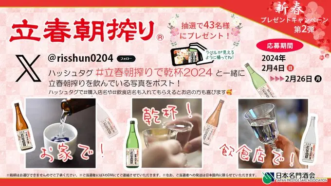 【締切】2/26(月)【応募】X【提供】立春朝搾り キャンペーン概要 アレまであと2日😍てなわけで立春朝搾りCP第二弾🎉拡散してくれたもれ~🙏 「立春朝搾りのある風景」共有CP😎 ①立春朝搾り公式Xをフォロー②#立春朝搾りで乾杯2024 と共に立春朝搾りの写真投稿リポストしてくれるとありがたし❗(笑) 抽選で4️⃣3️⃣名様に立春朝搾りをプレゼント😊