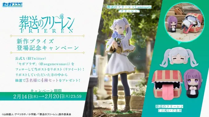 【締切】2/20(火)23:59【応募】X【提供】セガプラザ キャンペーン概要 【応募用ツイート】TVアニメ『葬送のフリーレン』ミニぬいぐるみ(全3種)が2/16から#フリーレン の #Luminasta フィギュアは2/22から順次登場✨ こちらをセットにして3名様にプレゼント🎁フォロー&リポストでご参加ください。 ▼製品詳細https://segaplaza.jp/lp/frieren/#frieren #セガプライズ