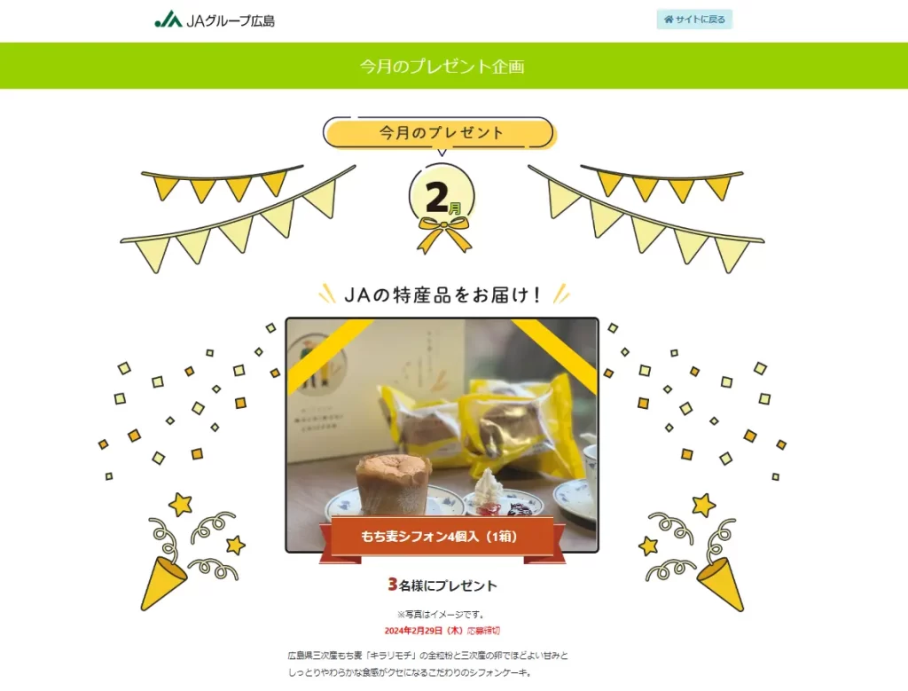 【締切】2/29(木)【応募】Web【提供】JAグループ広島 キャンペーン概要 ▼応募方法Webアンケートに回答 ▼プレゼント内容JAの特産品「もち麦シフォン4個入(1箱)」 広島県三次産もち麦「キラリモチ」の全粒粉と三次産の卵でほどよい甘みとしっとりやわらかな食感がクセになるこだわりのシフォンケーキ。 ▼人数3名様にプレゼント