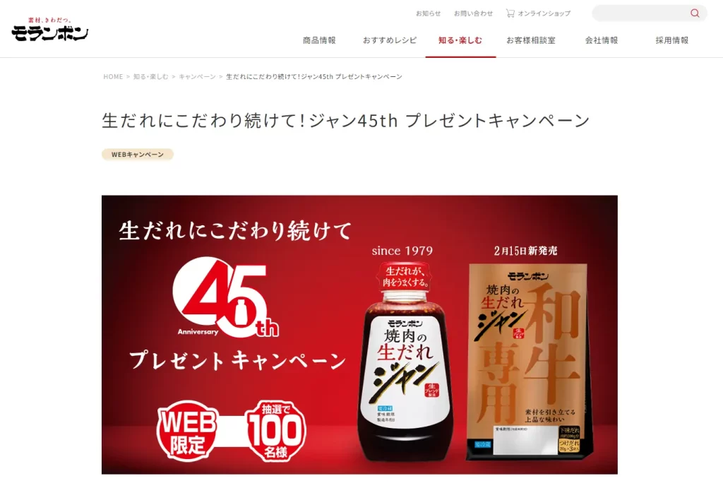 【締切】2/29(木)【応募】Web【提供】モランボン キャンペーン概要 ▼賞品(各1個)ジャン 焼肉の生だれ 240gジャン 焼肉の生だれ 和牛専用 ▼当選者数100名様(抽選) ▼応募方法 「ご応募はこちら」ボタンをクリックして、「応募フォーム」に必要事項をご入力のうえ、ご応募ください。