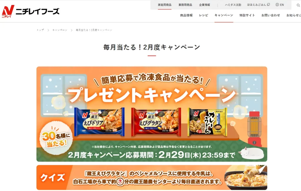 【締切】2/29(木)23:59【応募】Web【提供】ニチレイフーズ キャンペーン概要 ▼応募方法『蔵王えびグラタン』の商品詳細ページを確認して、「キャンペーンに応募する」ボタンから応募画面にアクセスし、画面に従い必要事項に答えてご応募ください。ご応募にはメールアドレス、アンケートの入力が必要です。 ▼当選人数/当選賞品抽選により、以下の商品が30名様に当たります。『蔵王えびドリア』『蔵王えびグラタン』『カレーうどん』各1袋、合計3袋 ▼応募締切2024年2月29日(木) 23:59