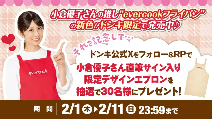 『小倉優子さん直筆サイン入り限定デザインエプロン』が抽選で30名様に当たります❣️🎁😍