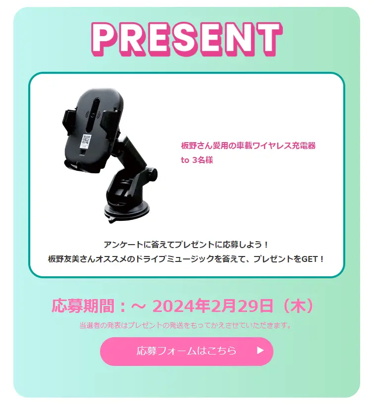 【締切済み】【3名様】板野友美さん愛用の「車載ワイヤレス充電器」が当たる!By kenshopoint.com / 2024年1月31日 キャンペーン詳細 板野さん愛用の車載ワイヤレス充電器 to 3名様 アンケートに答えてプレゼントに応募しよう!板野友美さんオススメのドライブミュージックを答えて、プレゼントをGET! 応募する
