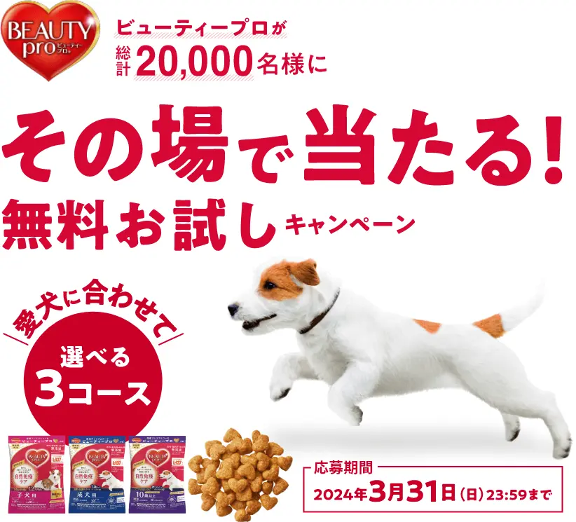 「子犬」「成犬」「シニア犬」コースの中から好きなコースを選んでくじに参加。その場で当たる無料お試しキャンペーン開催中!