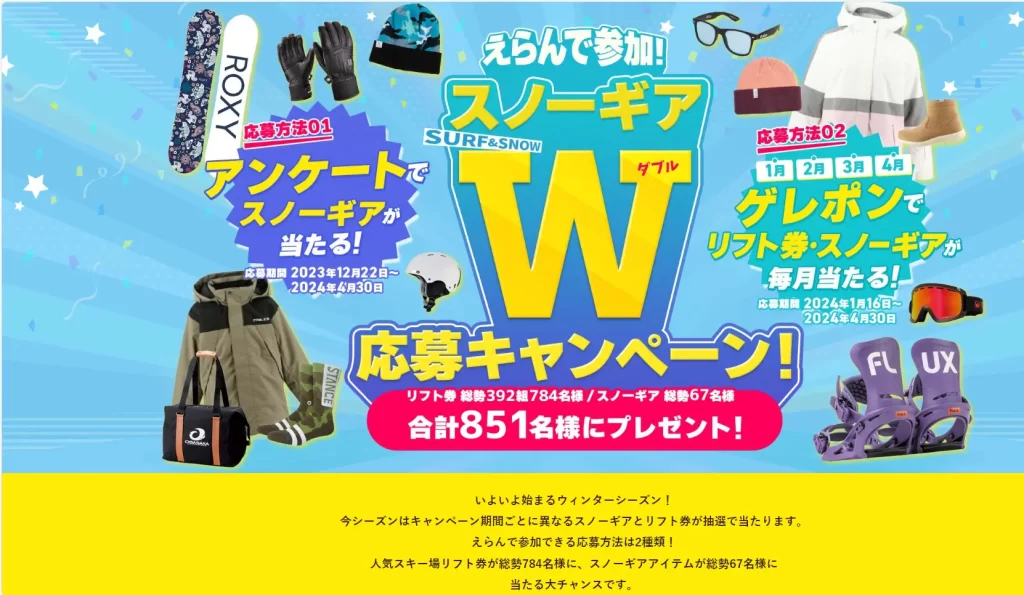 「スキー場リフト券」392組784名様、「スノーギア」67名様の合計851名様にスキー・スノボー関連アイテムが当たるキャンペーン開催中!