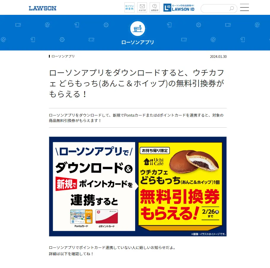 ローソンアプリをダウンロードして、新規でポイントカードを連携すると、対象の商品無料引換券がもらえます。