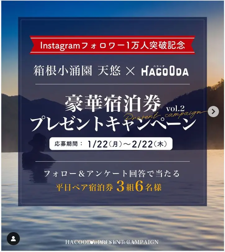 ●賞品:箱根小涌園 天悠 平日ペア宿泊券 3組6名様