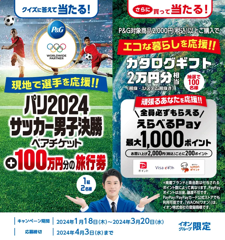 クイズに答えると抽選で「パリ2024サッカー男子決勝ペアチケット +100万円分の旅行券」が当たります。