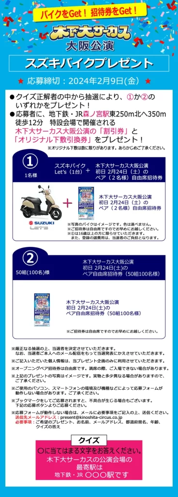 ①【1名様】スズキバイク Let’s(1台)+木下大サーカス大阪公演の初日2月24日(土)のペア(2名様)自由席招待券