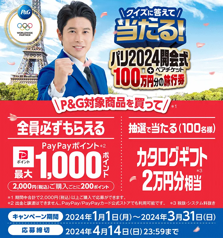 クイズに答えると抽選で「パリ2024開会式ペアチケット+100万円分の旅行券」が当たります。