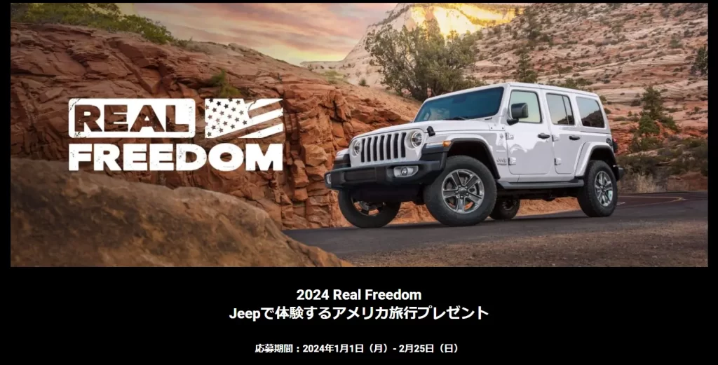 キャンペーン詳細 2名1組ご招待のキャンペーン 応募期間:2024年1月1日(月)- 2月25日(日) 【賞品】Real Freedom in USAJeepで体験するアメリカ旅行1組2名様 【主な内容】1人につき100万円分の旅行費用・日本 ― アメリカ主要都市間の往復航空券・宿泊費・Jeepレンタカー代など ※100万円を超えた場合、差額はお客様のご負担となります。