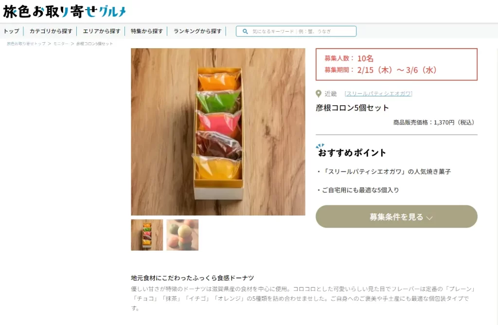 【締切】3/6(水)【応募】Web【提供】旅色お取り寄せグルメ キャンペーン概要 ▼応募方法『モニター募集中の商品一覧』 より、食べたい商品に応募 ▼賞品(10名)スリールパティシエオガワ「彦根コロン5個セット」 「スリールパティシエオガワ」の人気焼き菓子ご自宅用にも最適な5個入り