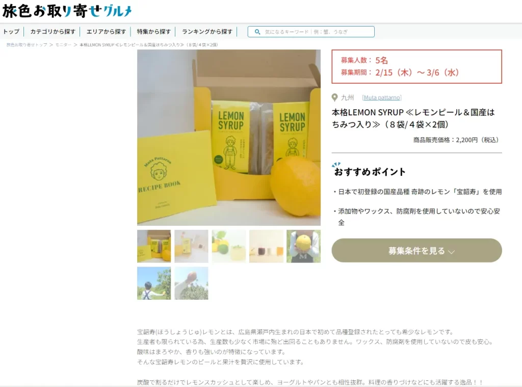 【締切】3/6(水)【応募】Web【提供】旅色お取り寄せグルメ キャンペーン概要 ▼応募方法『モニター募集中の商品一覧』 より、食べたい商品に応募 ▼賞品(5名)Muta pattarno「本格LEMON SYRUP ≪レモンピール&国産はちみつ入り≫(8袋/4袋×2個)」 日本で初登録の国産品種 奇跡のレモン「宝韶寿」を使用添加物やワックス、防腐剤を使用していないので安心安全