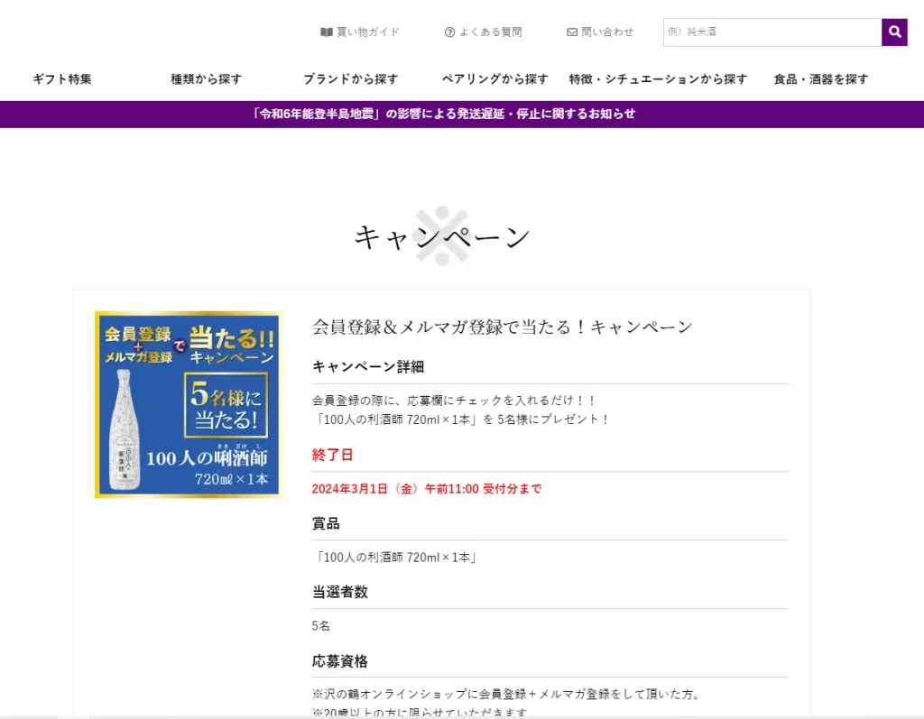 【締切】3/1(金)11:00【応募】Web【提供】沢の鶴 キャンペーン概要 会員登録&メルマガ登録で当たる!キャンペーン 会員登録の際に、応募欄にチェックを入れるだけ!!「100人の利酒師 720ml×1本」を 5名様にプレゼント! 終了日2024年3月1日(金)午前11:00 受付分まで