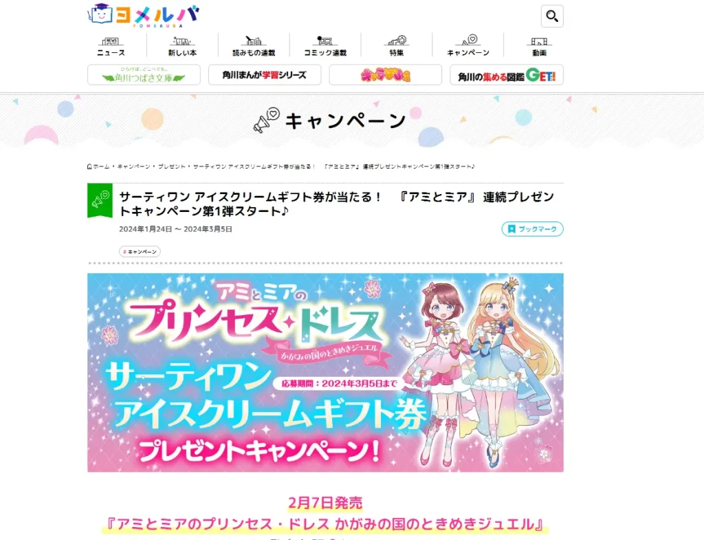 【締切】3/5(火)23:59【応募】Web【提供】KADOKAWA キャンペーン概要 サーティワン アイスクリームギフト券が当たる! 『アミとミア』 連続プレゼントキャンペーン第1弾スタート♪ 【キャンペーン期間・賞品】第1期:2024年1月24日(水)~2024年3月5日(火)23:59サーティワン アイスクリームギフト券 2000円分(500円券×4枚)・・・5名様 【応募方法】①注意事項を確認②応募フォームに必要事項を入力③応募完了
