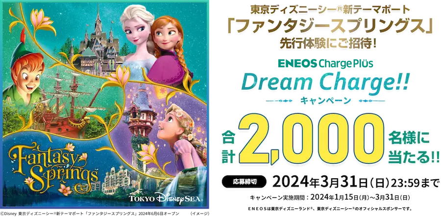 キャンペーン概要 ■キャンペーン概要キャンペーン実施期間中にENEOS Charge Plusで20分以上充電利用いただいたお客様の中から抽選で下記賞品をプレゼントするキャンペーンです。 ■キャンペーン実施期間2024年1月15日(月)10:00~3月31日(日)23:59※1※1 キャンペーン期間終了後に抽選を行います。 ■賞品および当選者数・ファンタジースプリングス・スポンサープレビューパスポート(ファンタジースプリングス限定)(ペア) 100組200名様※2・ファンタジースプリングスグッズ 1,800名様※3※2 東京ディズニーシーのその他のテーマポートにはご入場いただけません。なお、ファンタジースプリングス入場日時は、2024年5月24日(金)9:30~13:30となります。※3 上記2つの賞品が重複して当選することはありません。 【提供】ENEOS